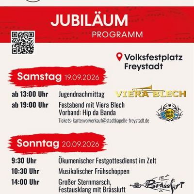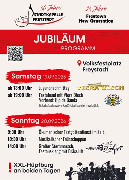 Am 19.09. und 20.09.2026 feiern die Stadtkapelle Freystadt 50-jähriges und das Nachwuchsorchester Freetown New Generation 25-jähriges Jubiläum. Veranstaltungsort ist der Volksfestplatz in...