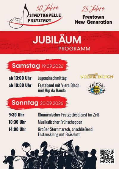 VereinAm 19.09. und 20.09.2026 feiern die Stadtkapelle Freystadt 50-jähriges und das Nachwuchsorchester Freetown New Generation 25-jähriges Jubiläum. Veranstaltungsort ist der Volksfestplatz in Freystadt.